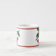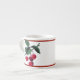 Xícara espresso branca com uma imagem vintage da década de 1940, em ambos os lados, de cerejas vermelhas. Bordas vermelhas. Ver pote de doces, frasco, arremessador, placa de papel, vidro fotografado, bule e portas copos correspondentes. Veja toda a coleção Patriótica de Mug 40s na COMIDA/BEV | Seção pratos.