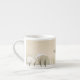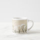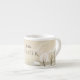 Winter landscape with trees, a house, all covered in white snow. A friendly Hello Winter in the middle. Beige and brown color theme.