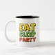 Crie um design divertido, enérgico e moderno centrado no tema "Coma, Dorme, Festa." Este design será usado em vários formatos, como t-shirts, posters, adesivos e gráficos digitais, apelando a uma audiência jovem e de saída. O design deve transmitir uma vibração viva e cuidadosa enquanto permanece atraente visualmente.