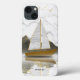 Capas de iphone de nomes personalizados de mármore Dourado moderno, Na moda de navegação, apresentam um fundo branco e cinza de mármore com um iate de ouro e colinas rolantes no fundo. Personalizado com seu nome na tipografia moderna da escrita negra. Elaborado por ©Evco Studio www.zazzle.com/store/evcostudio