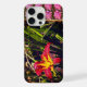 A slightly vintage looking photograph of a red and yellow day lily with drops of water on the petals and leaves.