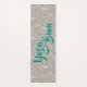 Água espumante sobre a areia ouro da praia. Diz "vagabundo de ioga" em vez de vagabundo de praia em turquesa. As costas estão turquesas.
