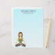 Ilustração vetorial na moda de uma linda morena fazendo ioga. A mulher está sentada na posição tradicional de lótus. Ela está vestindo um tanque verde e calças de cinza escuras. O fundo é um adorável gradiente azul. Há também um texto que diz "instrutor de Yoga" junto com um nome personalizável.