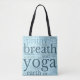 O amante de ioga tote saco com termos de ioga em tons de azul e verde, arranjado em um moderno design de arte de metrô. Mostrado é o saco de tote médio. Design por Chamado. #Yoga #YogaLover (Se quiser transferir este design para outro produto, talvez seja necessário usar a ferramenta de personalização para ajustar o tamanho (escala) desta imagem SVG de acordo com o seu gosto.)