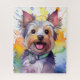 Uma imagem de arte digital de um animado cão Terrier Yorkshire é representada em aquarelas vibrantes, com salpicos de cores brilhantes no fundo acrescentando uma sensação energética. A expressão brincalhona no rosto do cão é realçada pelo seu sorriso largo e orelhas tocadas.