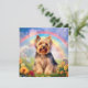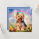 Um cartão de compaixão personalizado do Yorkshire Terrier Yorkie com uma bela pintura de Yorkshire Terrier numa colina celestial com uma bela sobrecarga do arco-íris. Simbolizando o cão Yorkshire Terrier passou a ponte arco-íris para o céu castrado. Você pode personalizá-lo com o nome do seu próprio cão Yorkshire Terrier ou qualquer outro texto no verso do cartão. Faz um memorial especial ou presente de simpatia para qualquer amante de cães Yorkie se o seu querido cão tiver passado.