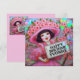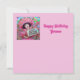 Yvonne está feliz no aniversário dela. Ela está vestindo uma fantasia especial para celebrar o dia. A parte traseira da placa tem uma pequena réplica da imagem frontal e muito espaço para escrever uma mensagem. O AI Bing prestou assistência na criação do cartão.