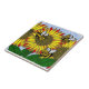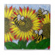 Um azulejo com os três zangões engraçados que zumbem em torno dos girassóis amarelos e alaranjados brilhantes grandes.
