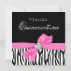 Uma zebra de tendência, Quinceanera, convite com um coração de diamante e uma ilustração de arco de fita rosa, destacando um design de impressão zebra preto e branco. Perfeito para uma zebra com o tema Quinceanera festa de aniversário. Personalize facilmente com os detalhes da festa de aniversário de 15! As designs são ilustrações/gráficos impressos - NÃO SÃO REALMENTE BRILHANTES OU DIAMANTES.