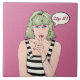 Uma obra de arte inspirada na poster de publicidade vintage dos anos 60 e anos setenta. Uma mulher bonita com cabelo verde. Ela está com os dedos nas lábios.